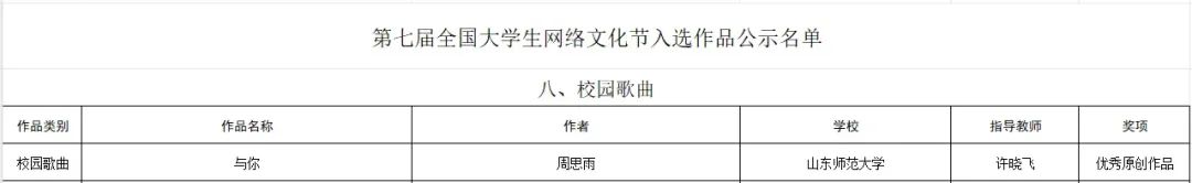 近日,由教育部思想政治工作司、中央网信办网络社会工作局主办的第七届全国大学生网络文化节遴选结果公示。经过资格审核、专家遴选(初选、复选、终选)、作品政审等程序,由我院周思雨同学创作、许晓飞老师指导、中俄师生共同演绎的原创歌曲《与你》从全国50771件作品中脱颖而出,荣获校园歌曲类“优秀原创作品”奖。