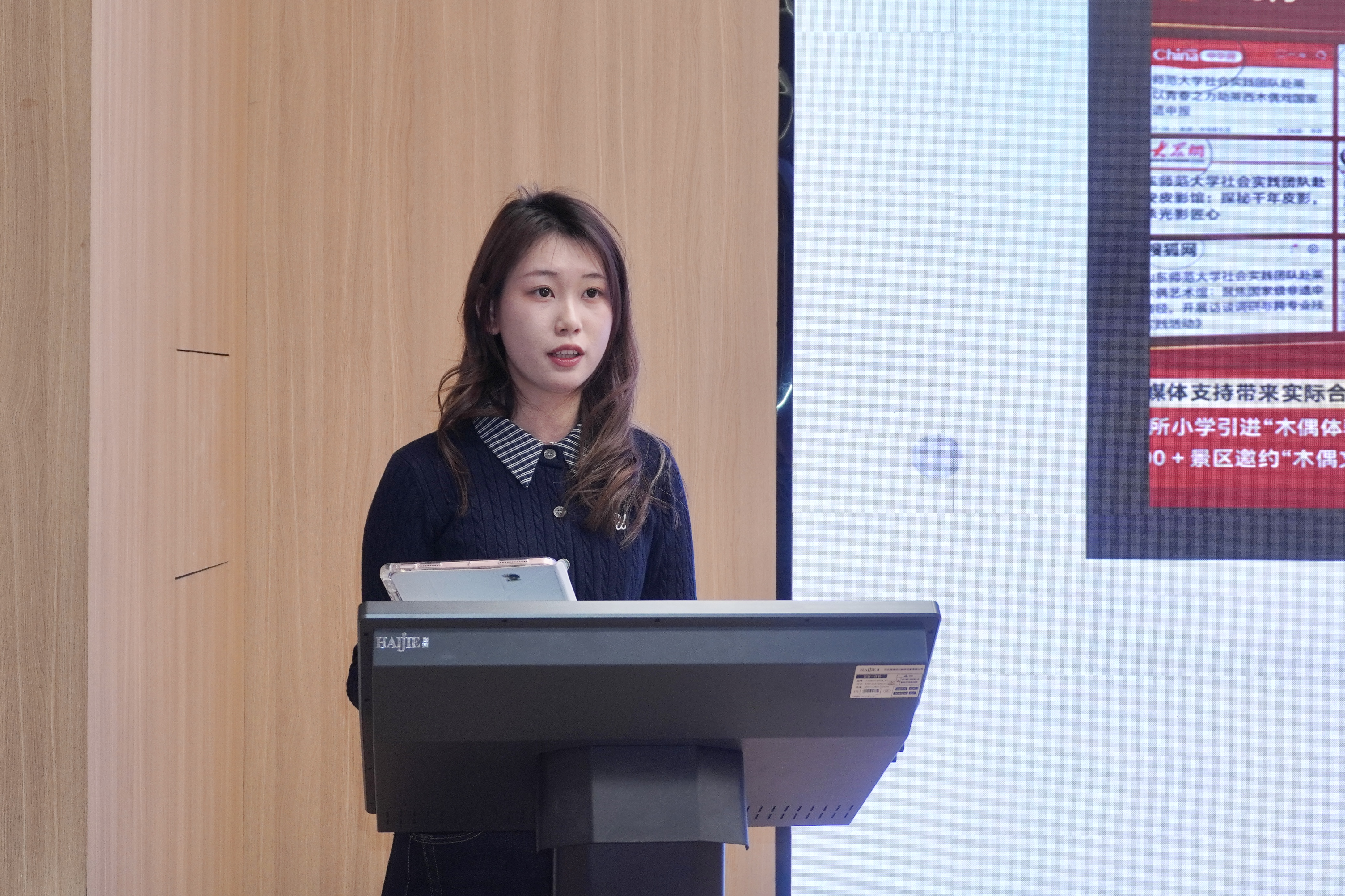 会上,国家级金奖项目负责人、2023级音乐班毛艺澄以其团队“莱西木偶戏”项目的孵化历程为例,分享了从常规实践进阶为国赛金奖的经验。她精炼出“精准选题、团队互补、成果累积”三大核心要素,鼓励同学们打破学科壁垒,通过跨专业协作实现资源聚合与项目升级。