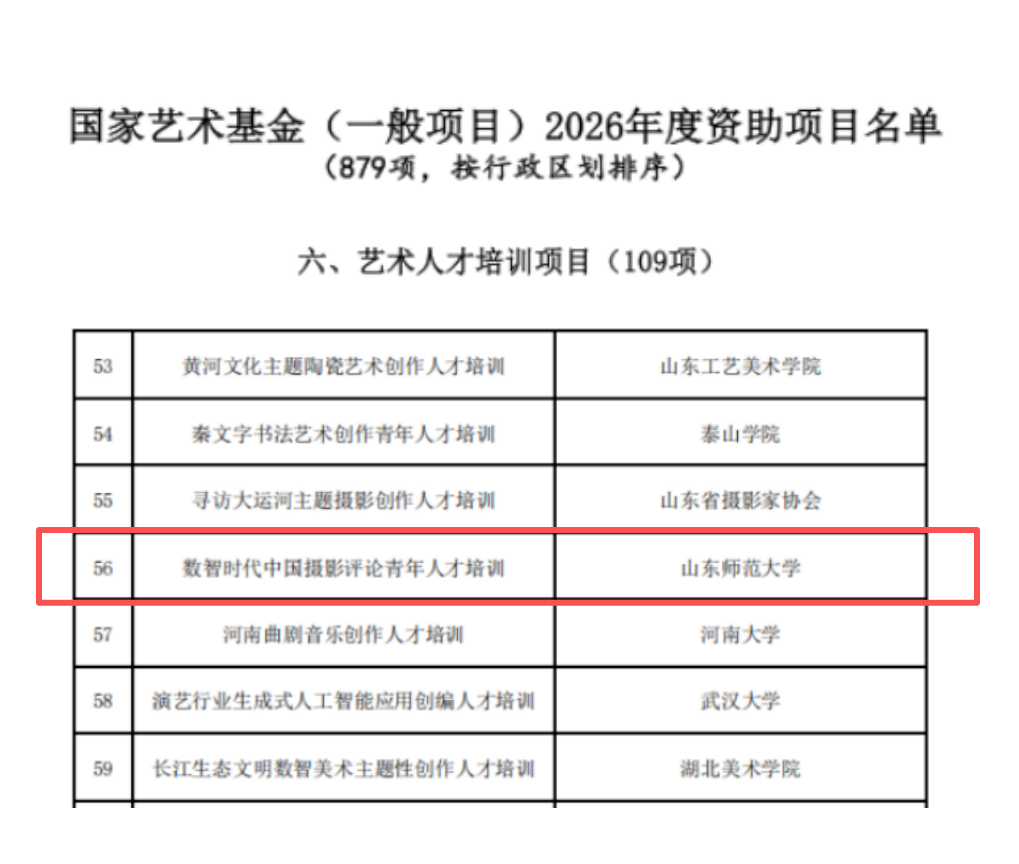 近日,国家艺术基金管理中心公布了《国家艺术基金(一般项目)2026年度资助项目名单》。我院副院长高佳作为负责人申报的《数智时代中国摄影评论青年人才培训》成功入选艺术人才培训项目,标志着我院在高层次科研建设与艺术人才培养方面取得新的突破。