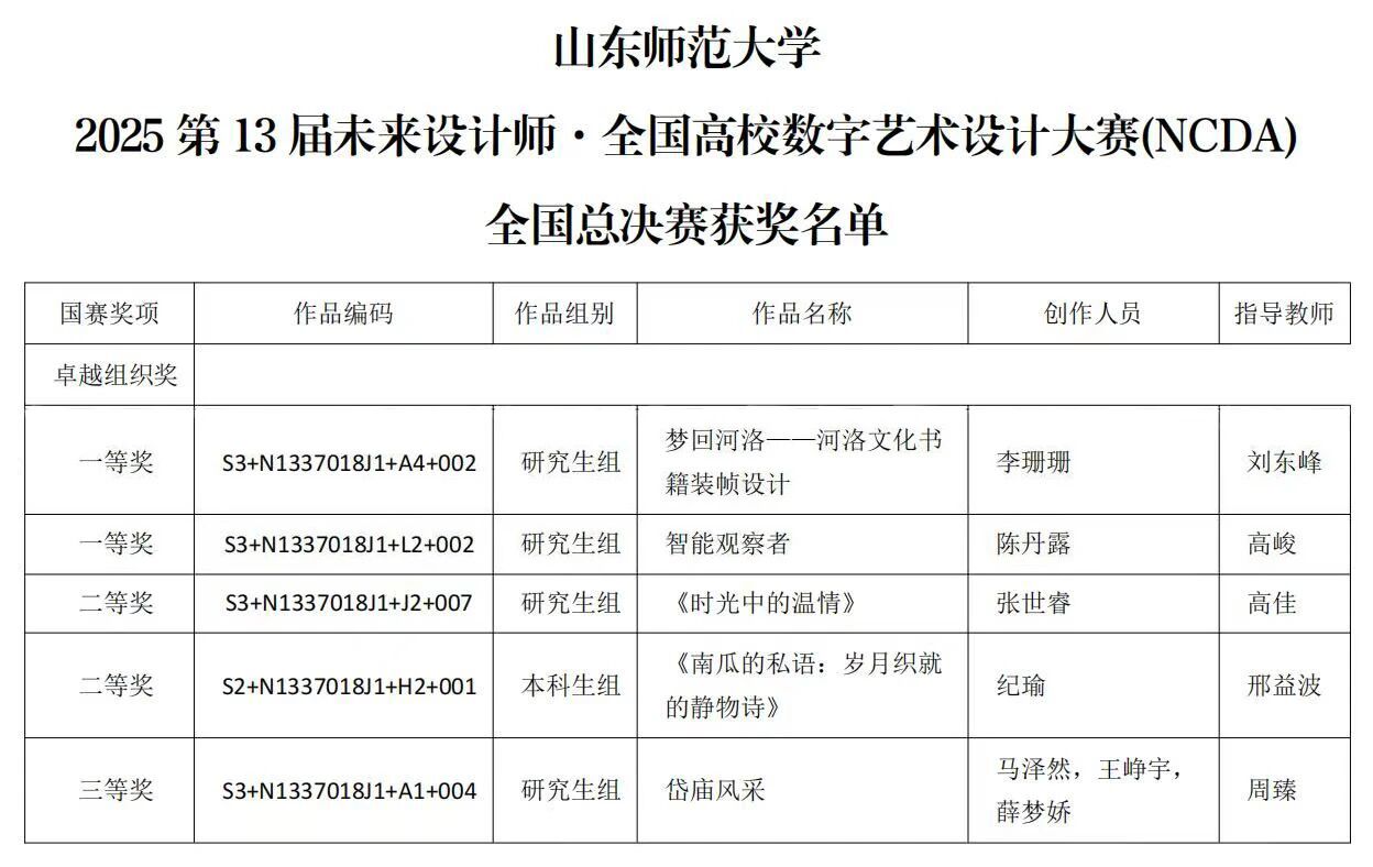 近日,2025第13届未来设计师·全国高校数字艺术设计大赛(NCDA)全国总决赛奖项公布,我院学生作品斩获国家级一等奖2项、二等奖2项、三等奖1项,并荣获卓越组织奖。