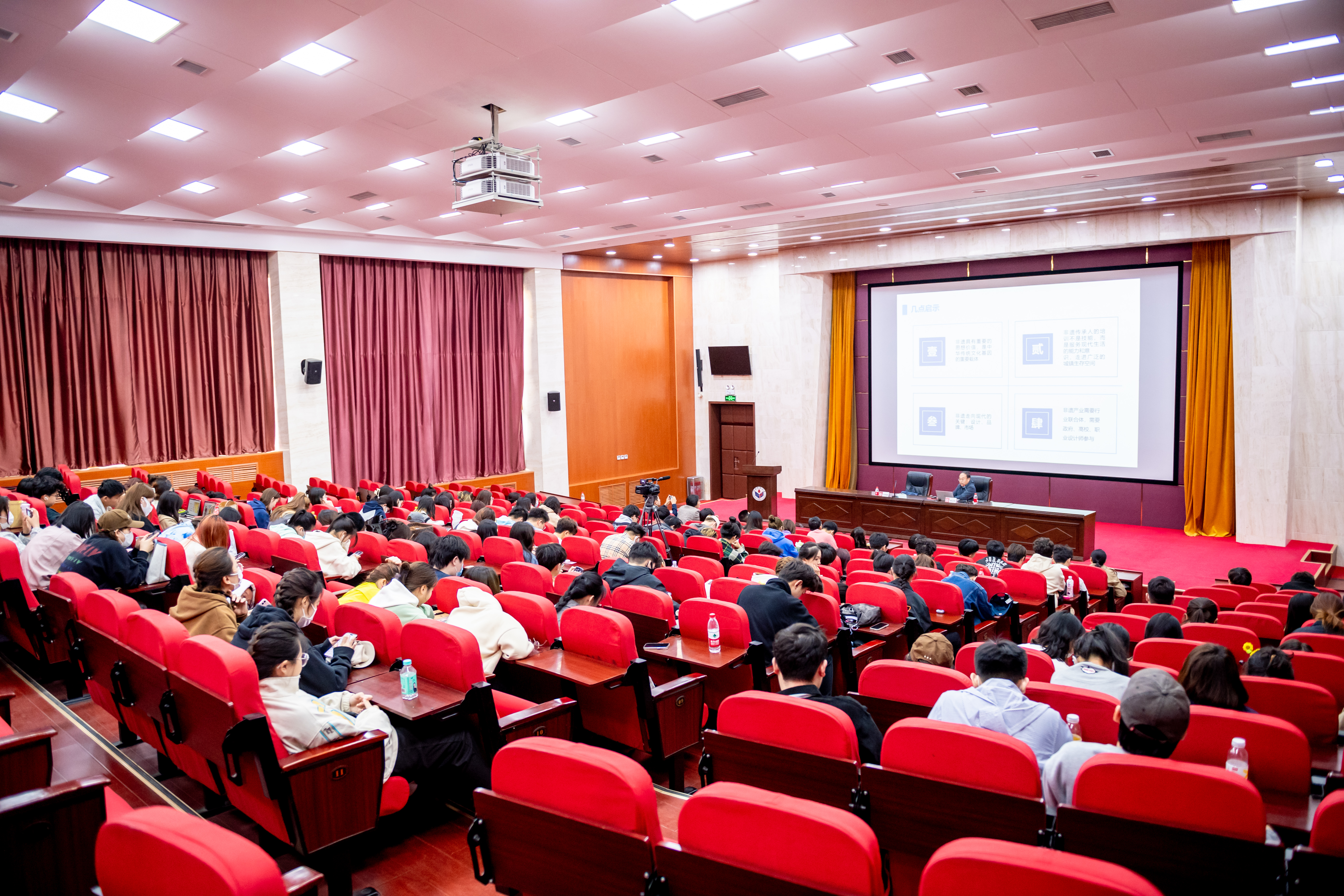 讲座伊始,刘东峰对主讲人董占军教授做了介绍,并对在场师生的到来表示欢迎。随后,董占军教授从思想史中引入主题,通过非遗的设计思想、非遗在新旧动能转化过程中的价值、非遗与传统工艺美术在国民教育中的作用等五个方面,从学理和实践的角度讲述了非遗作品中的设计思想与当代价值,梳理了国家创新战略转型与非遗的密切关系,并通过各地区代表性作品分析深入阐释了非遗现代转化在当代设计作品中的具体应用。最后,董占军教授结合非遗设计思想产业化的经典案例,讲解诸多非遗现代转化与应用的成果及其内在价值,详细阐述了个人对于非遗传承及工艺美术的认识与思考,引发了现场师生对当代非遗设计的深度思考。