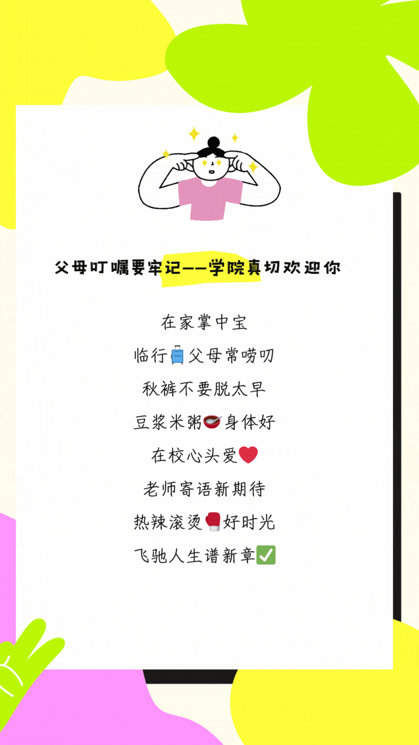 1.天冷加衣,注意保暖。返校时千万不能“要风度不要温度”,返校期间正值降温,穿衣以保暖舒适为主,小心受寒感冒。