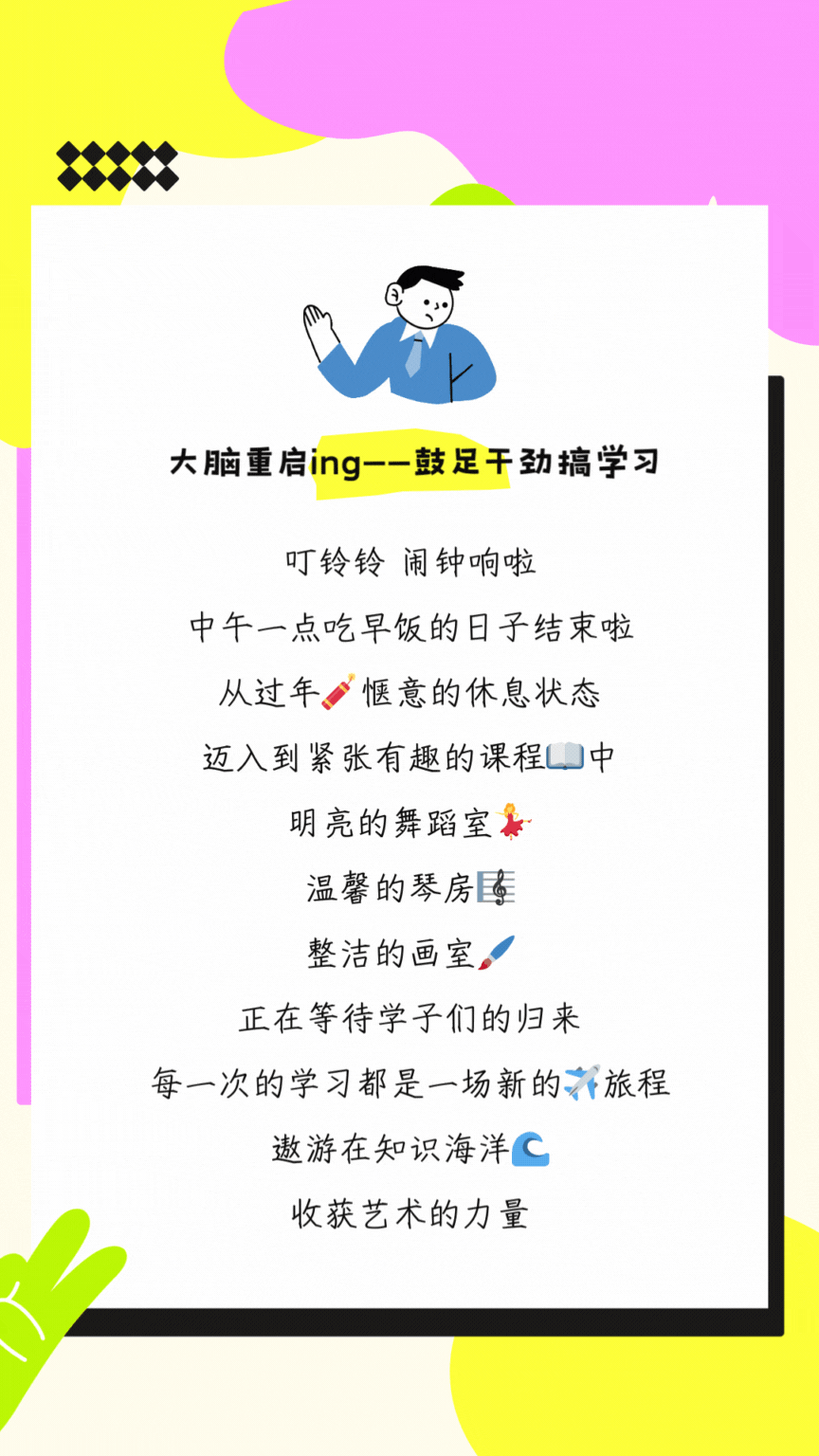 2.调节心态,积极面对学习生活。寒假长时间的放松,可能会导致返校时难以适应新学期学习强度,记得给自己积极的心理暗示,调节焦虑的心态。