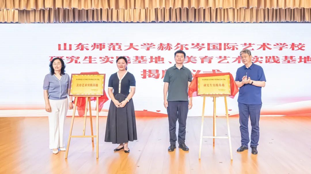 仪式现场,英国正版365首页副院长高佳、学术副院长宋丽萍与济南特殊教育中心校长于生丹、党总支书记薛庆师共同为“英国正版365首页美育艺术实践基地”“365(vip)英国上市研究生实践基地”揭牌。