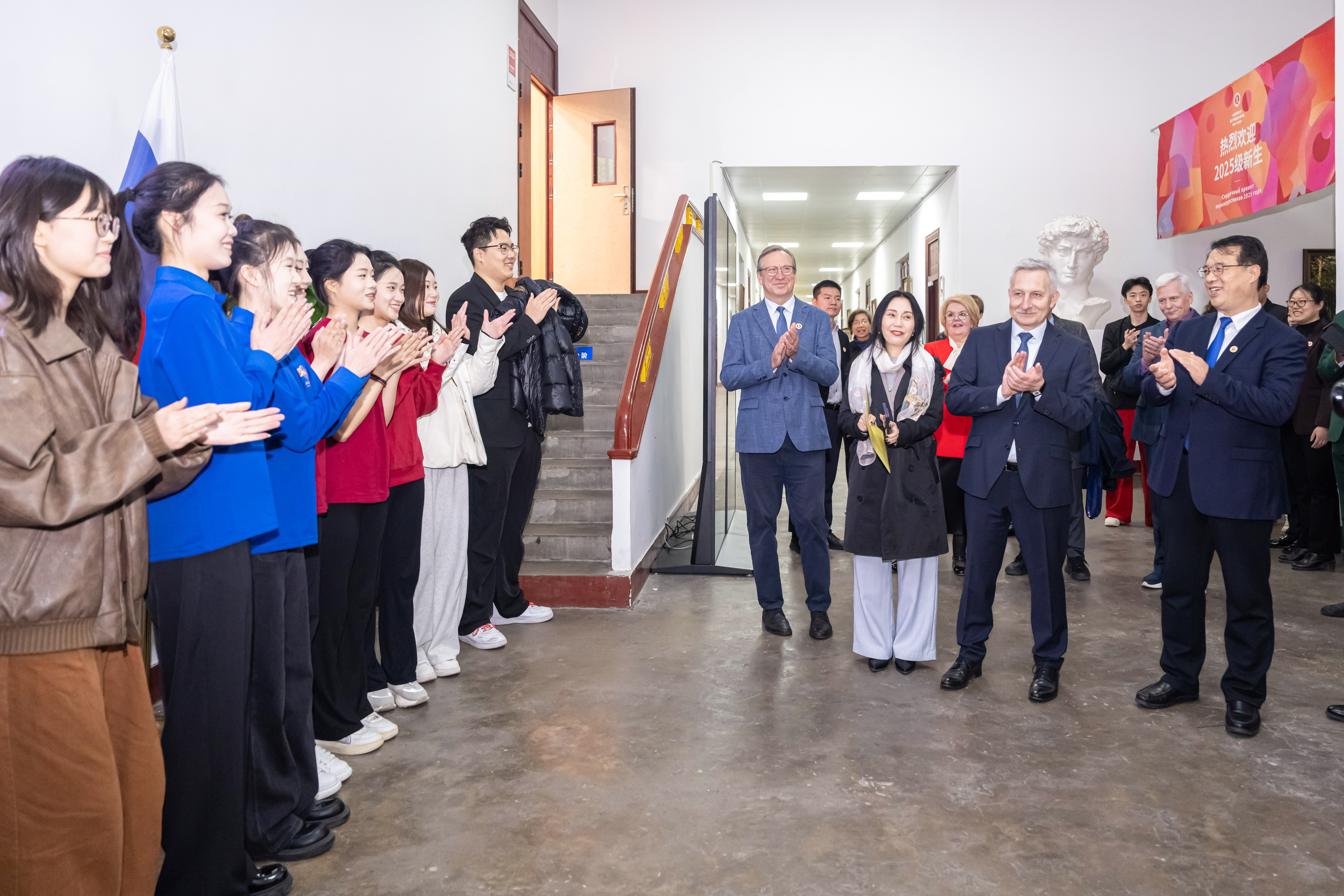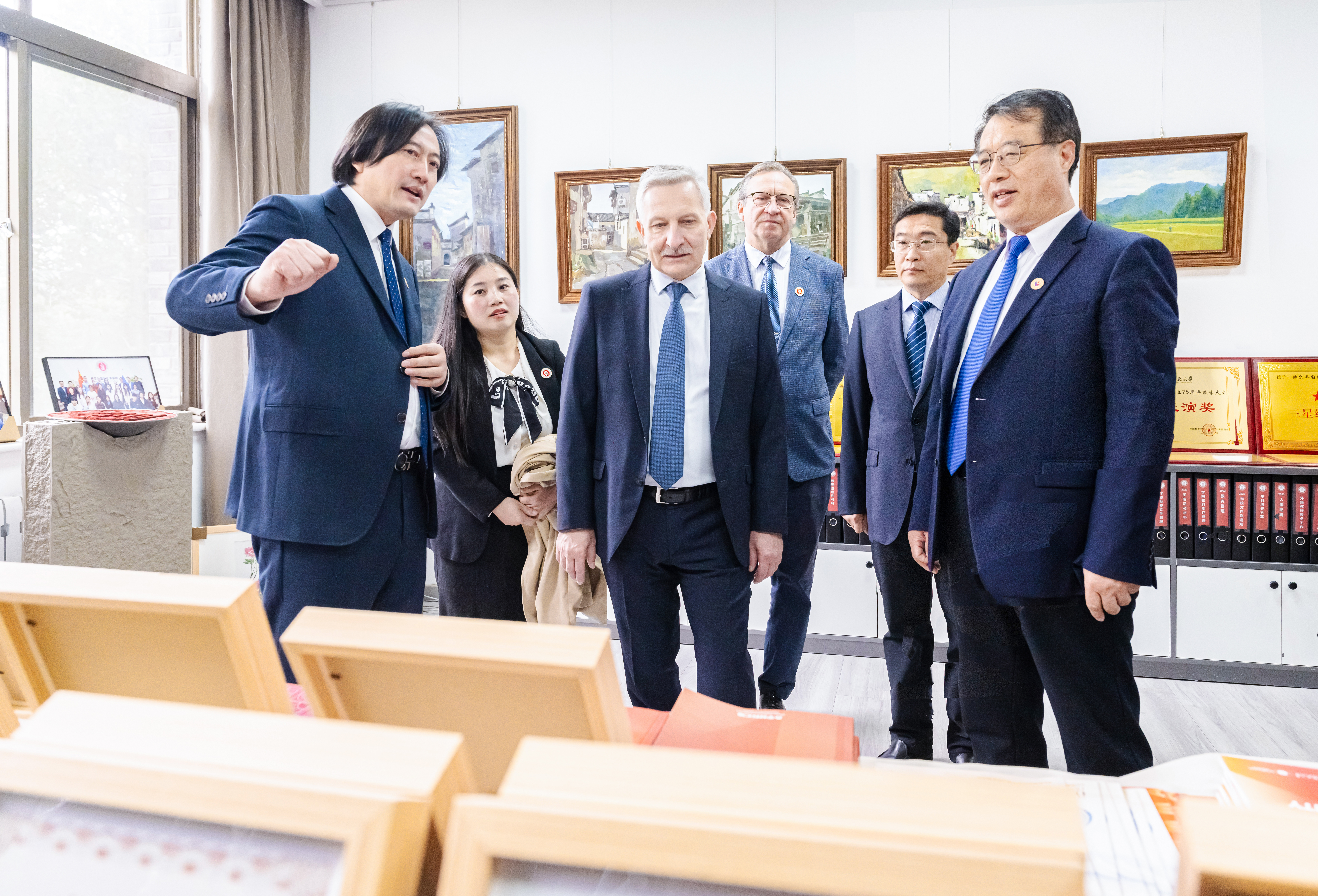 谢尔盖·瓦连京诺维奇·塔拉索夫一行在学院办学展厅回顾了学院的申办历程、交流互访与重要活动,详细了解了学院的师资力量与教育教学成果,并与学院班子成员、俄方院长亲切交流,为学院留下寄语。随后,学院领导向塔拉索夫校长赠予学院师生作品。