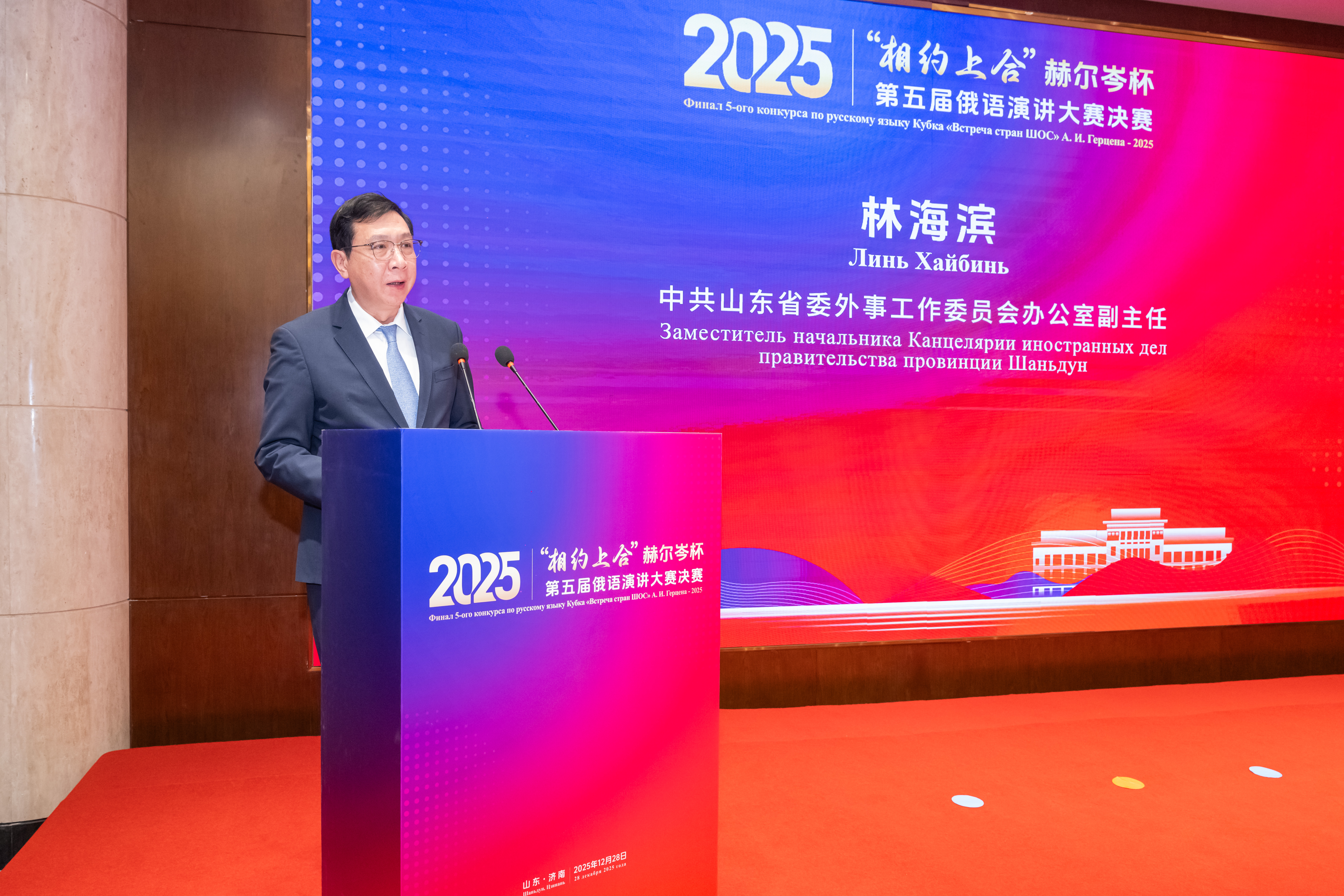 林海滨高度评价了大赛在推动山东省对外人文交流、服务国家总体外交和地方开放发展方面发挥的积极作用,在凝聚青年力量、讲好中国故事中的独特价值。他表示,“相约上合”已成为我省推进上合大家庭文化融通的靓丽外事品牌,为推动我省与俄罗斯教育、文化等领域合作提供了人才支撑与智力保障。