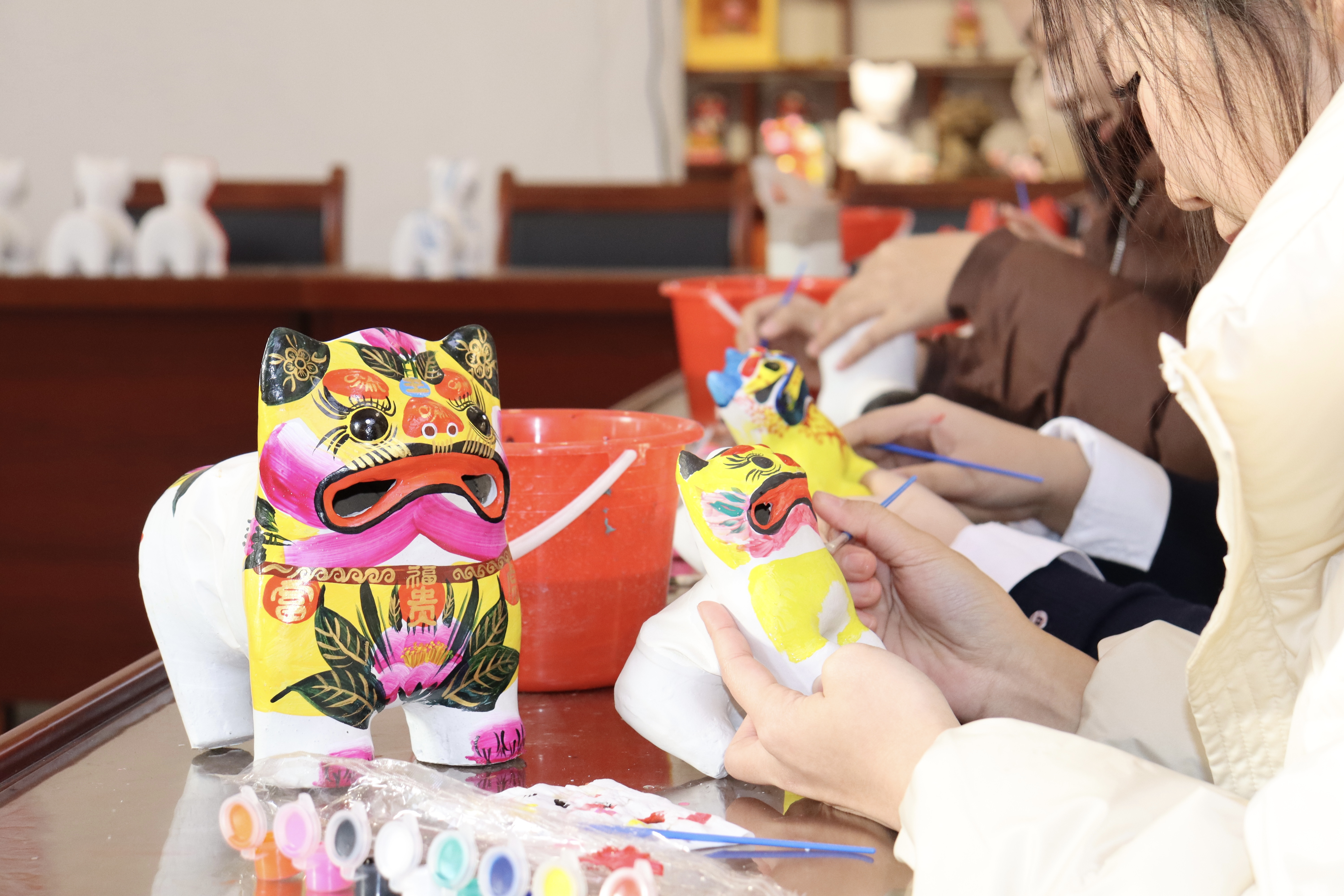 各实践队将所学非遗技艺付诸实践,走进社区与校园开展非遗教学与文化传递。在365(vip)英国上市幼儿园开展元旦游园会活动,通过皮影戏、画脸、糖画、漆扇等非遗互动体验,巧妙融合泉城文化。让孩子们在沉浸体验中接受非遗浸润,在实践中传承泉城文脉;在济南趵突泉社区里开设泥老虎、非遗剪纸课堂,带领孩子们用蜡笔勾勒心中的非遗模样;前往青岛幸福之家融合学校为特殊儿童开展扎染教学,细致指导扎结、浸染等全套工序,真切感受传统扎染技艺的独特魅力。